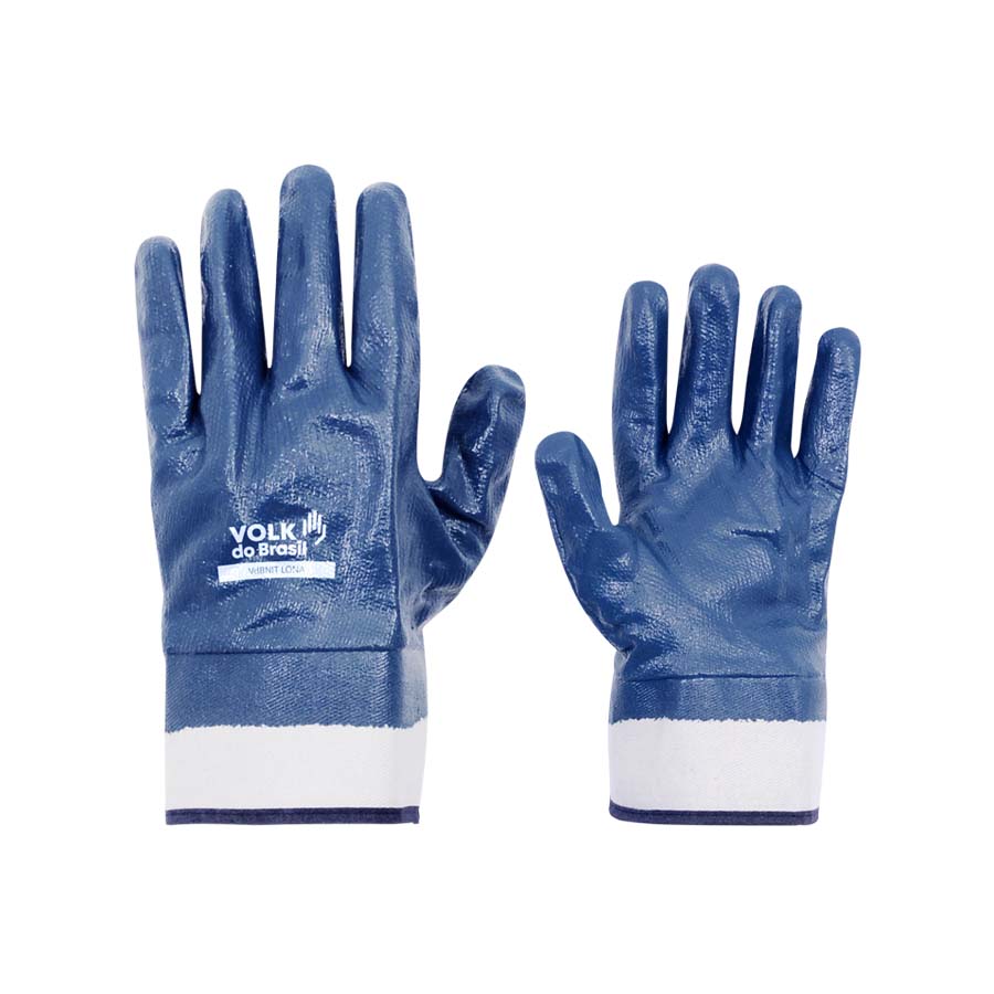 Luva de segurança confeccionada em fibras naturais, tipo “Jersey”, totalmente revestida em nitrila, lisa, punho de lona.
